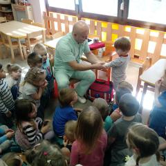 Dzisiaj nasze przedszkole odwiedził tata Frania, która jest lekarzem. Dzieci z ogromnym zainteresowaniem słuchały informacji przekazywanych przez naszego gościa oraz oglądały przyniesione przyrządy lekarskie. Pani Wojtek opowiadał dzieciom, na czym polega jego praca. Słuchał  bicia serduszek chętnych dzieci przez słuchawki lekarskie przełamując w ten sposób strach przed wizytą u lekarza. Dziękujemy Biedronki i Jeżyki.