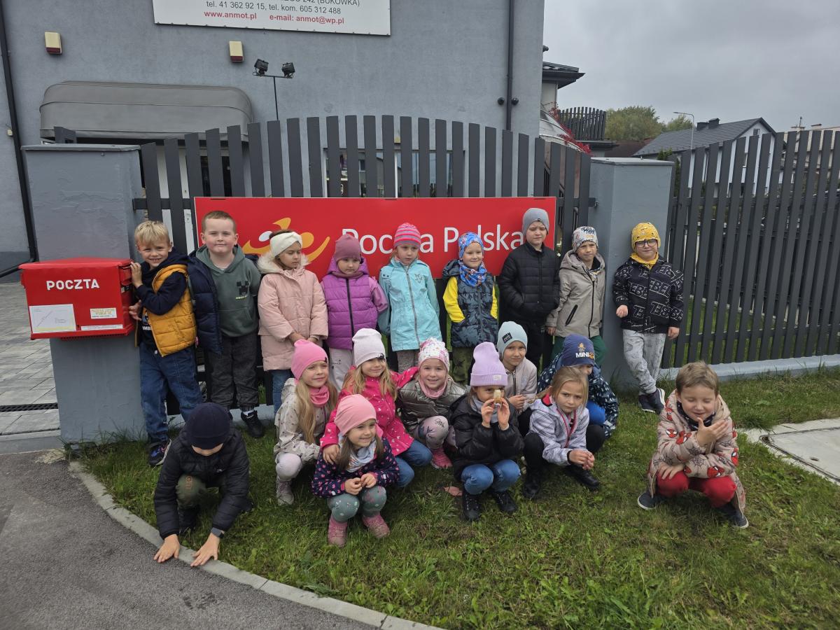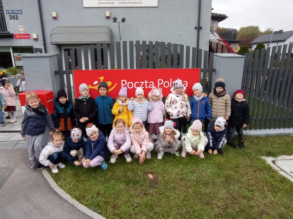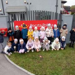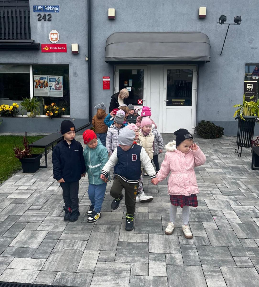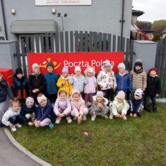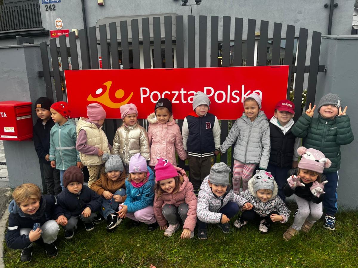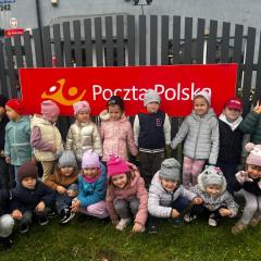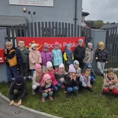 Dnia 9.10.2025 r. dzieci z grup  Wiewiórek, Biedronek i Motyli,  wybrały się na wycieczkę do pobliskiego urzędu pocztowego. Celem wyjścia było zapoznanie przedszkolaków z funkcjonowaniem poczty.