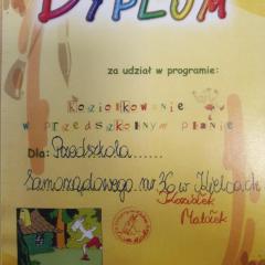 Przedszkolaki bardzo ciepło przyjęły Koziołka, delikatnie go podkuły i z ogromną radością uczestniczyły w przejażdżce pociągiem z Pacanowa do Kielc (na ul. Tujową 2). W podziękowaniu Koziołek Matołek obdarował dzieci kolorowankami, dyplomem oraz obiecał, że z pewnością ponownie Nas odwiedzi.