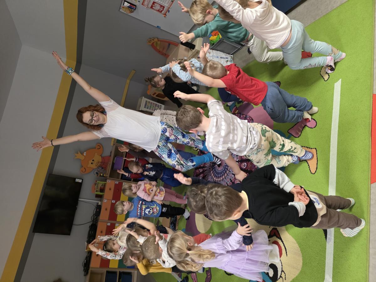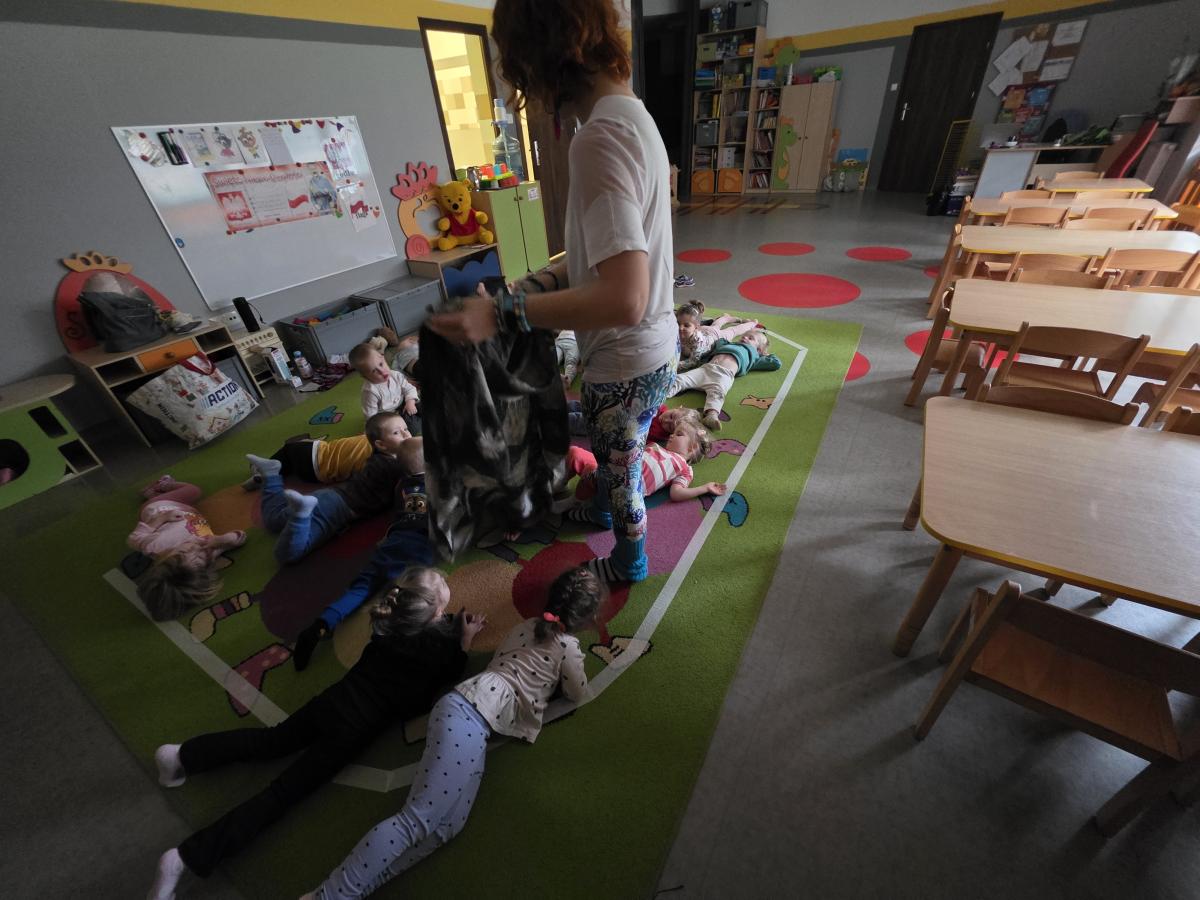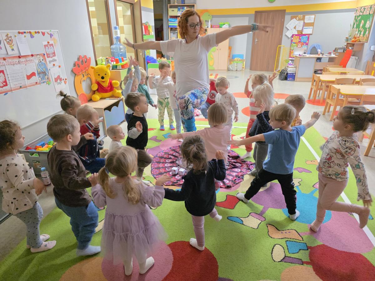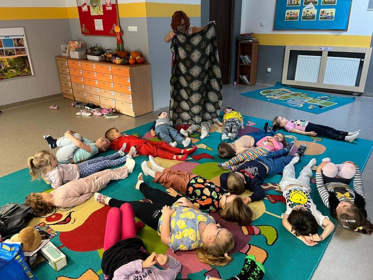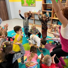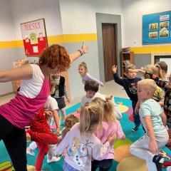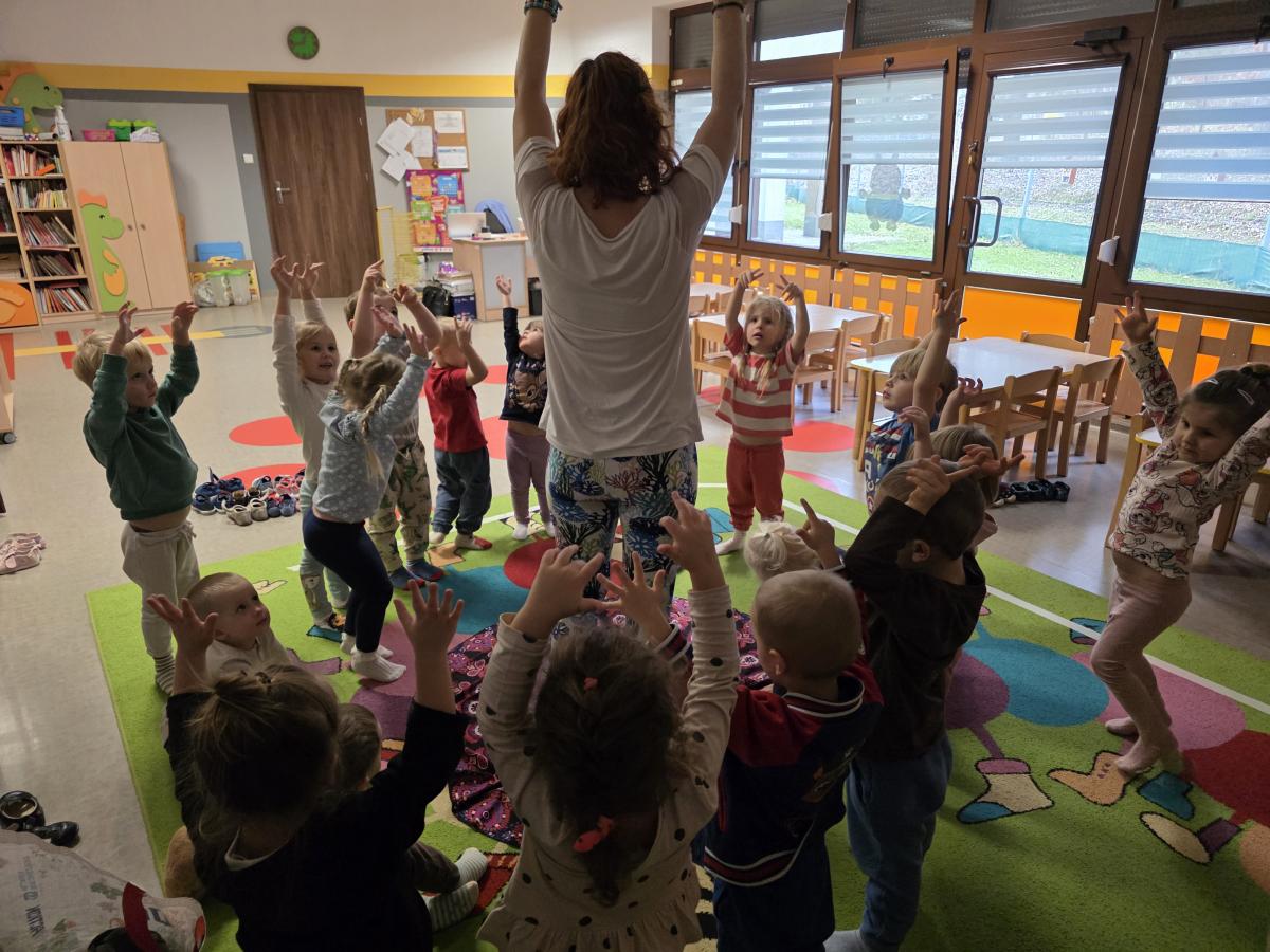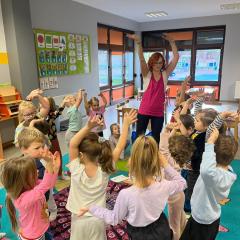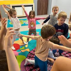 Dzieci z zaangażowaniem wykonywały kolejne asany, rozwijając równowagę, gibkość i koordynację, a jednocześnie ucząc się świadomego oddychania. Dzięki kostkom zajęcia były dynamiczne, pełne śmiechu i pozytywnej energii. Na zakończenie odbył się krótki relaks, podczas którego dzieci „opadły jak jesienne listki”, wyciszając ciało i umysł, a prowadząca przy pomocy chusty, dała im możliwość poczuć przyjemny jesienny wietrzyk.