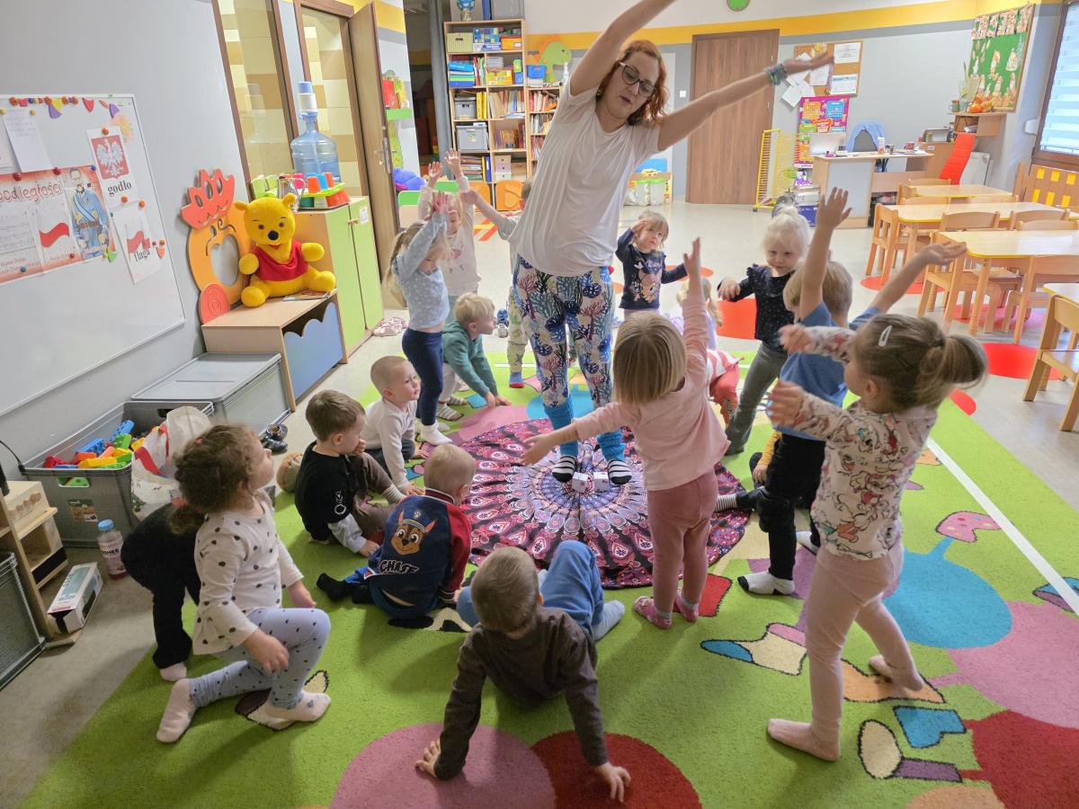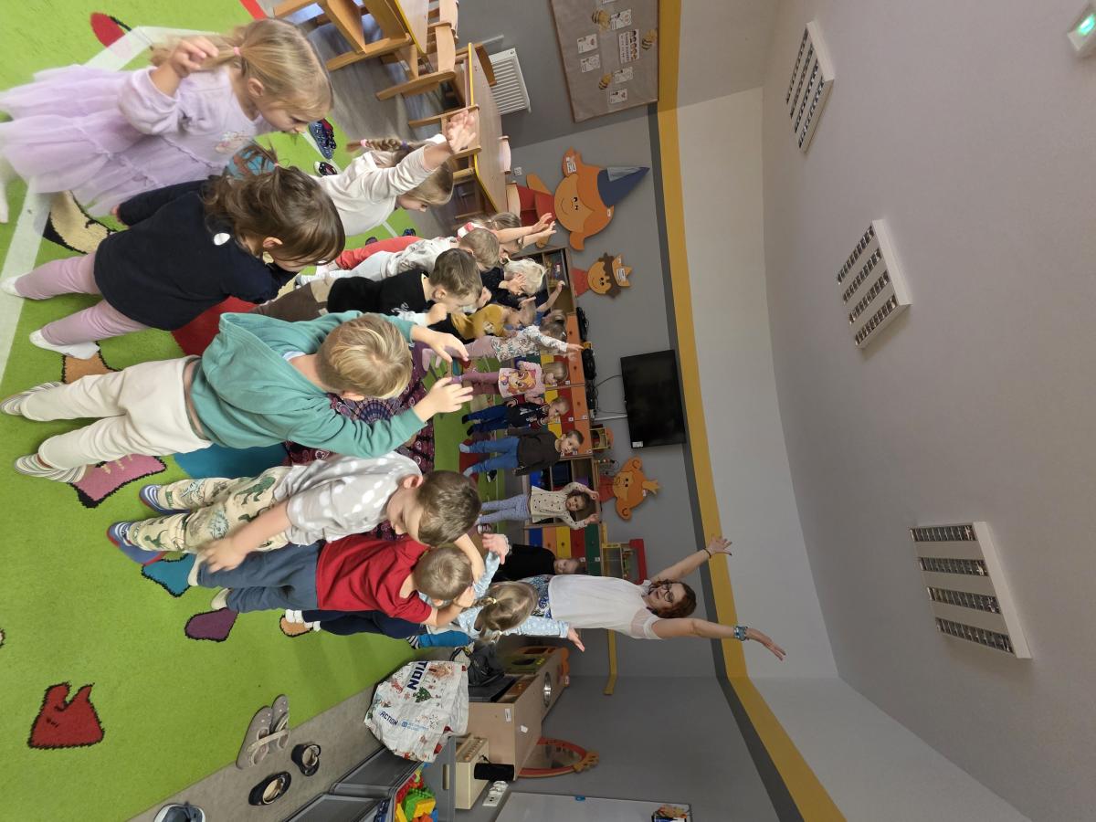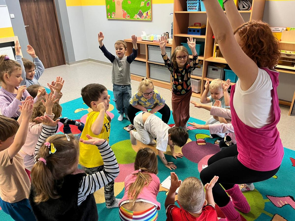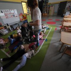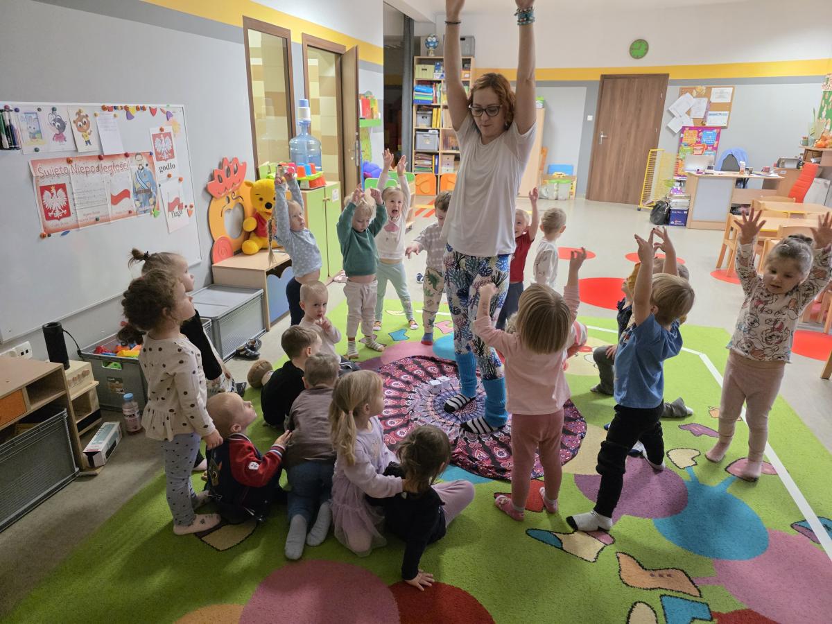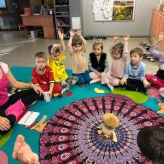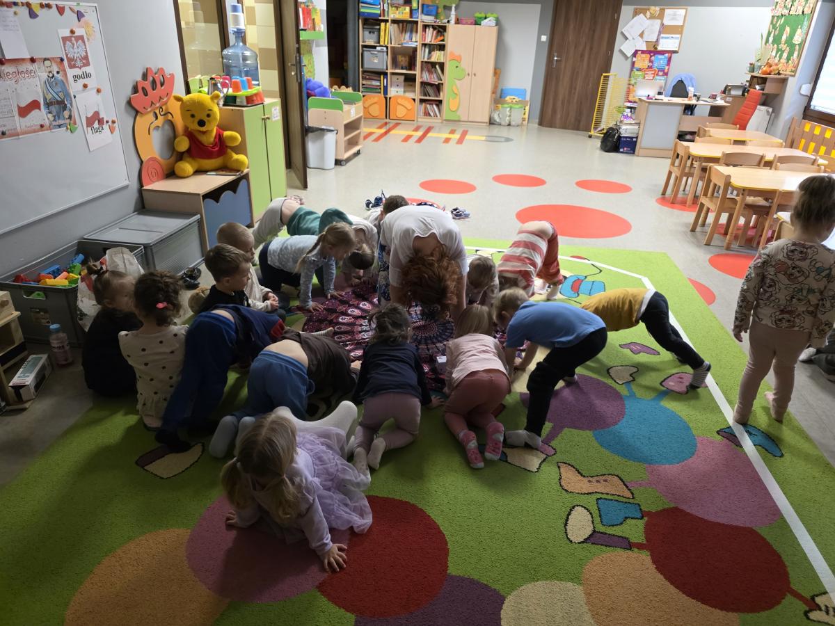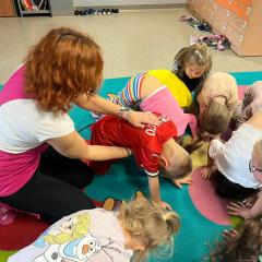 Dzieci z zaangażowaniem wykonywały kolejne asany, rozwijając równowagę, gibkość i koordynację, a jednocześnie ucząc się świadomego oddychania. Dzięki kostkom zajęcia były dynamiczne, pełne śmiechu i pozytywnej energii. Na zakończenie odbył się krótki relaks, podczas którego dzieci „opadły jak jesienne listki”, wyciszając ciało i umysł, a prowadząca przy pomocy chusty, dała im możliwość poczuć przyjemny jesienny wietrzyk.