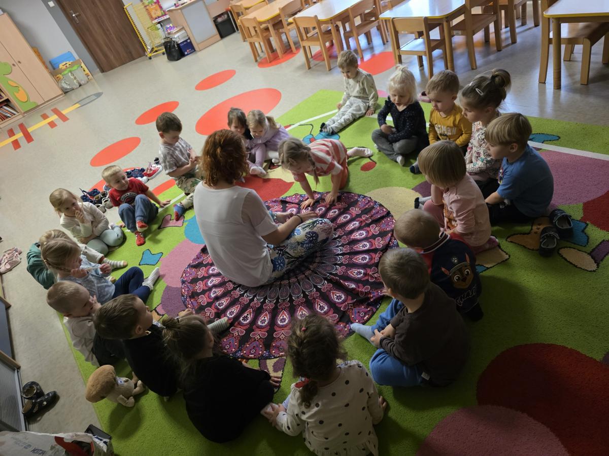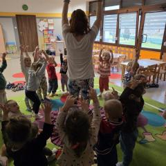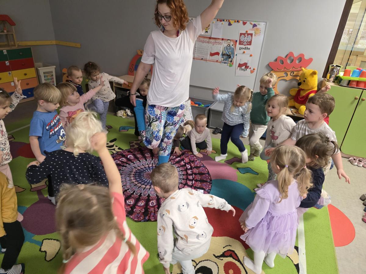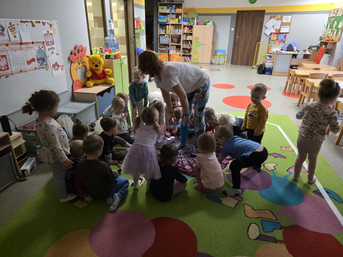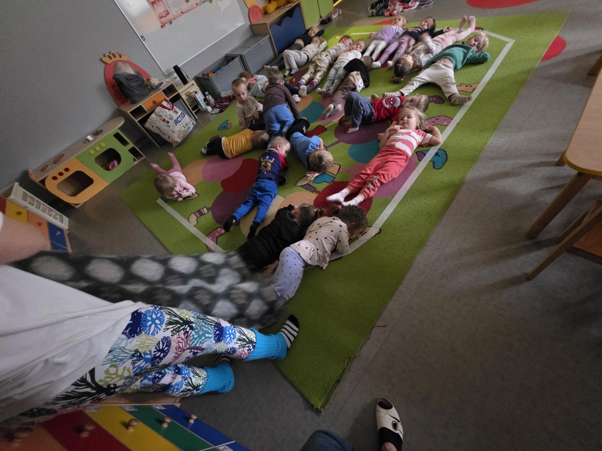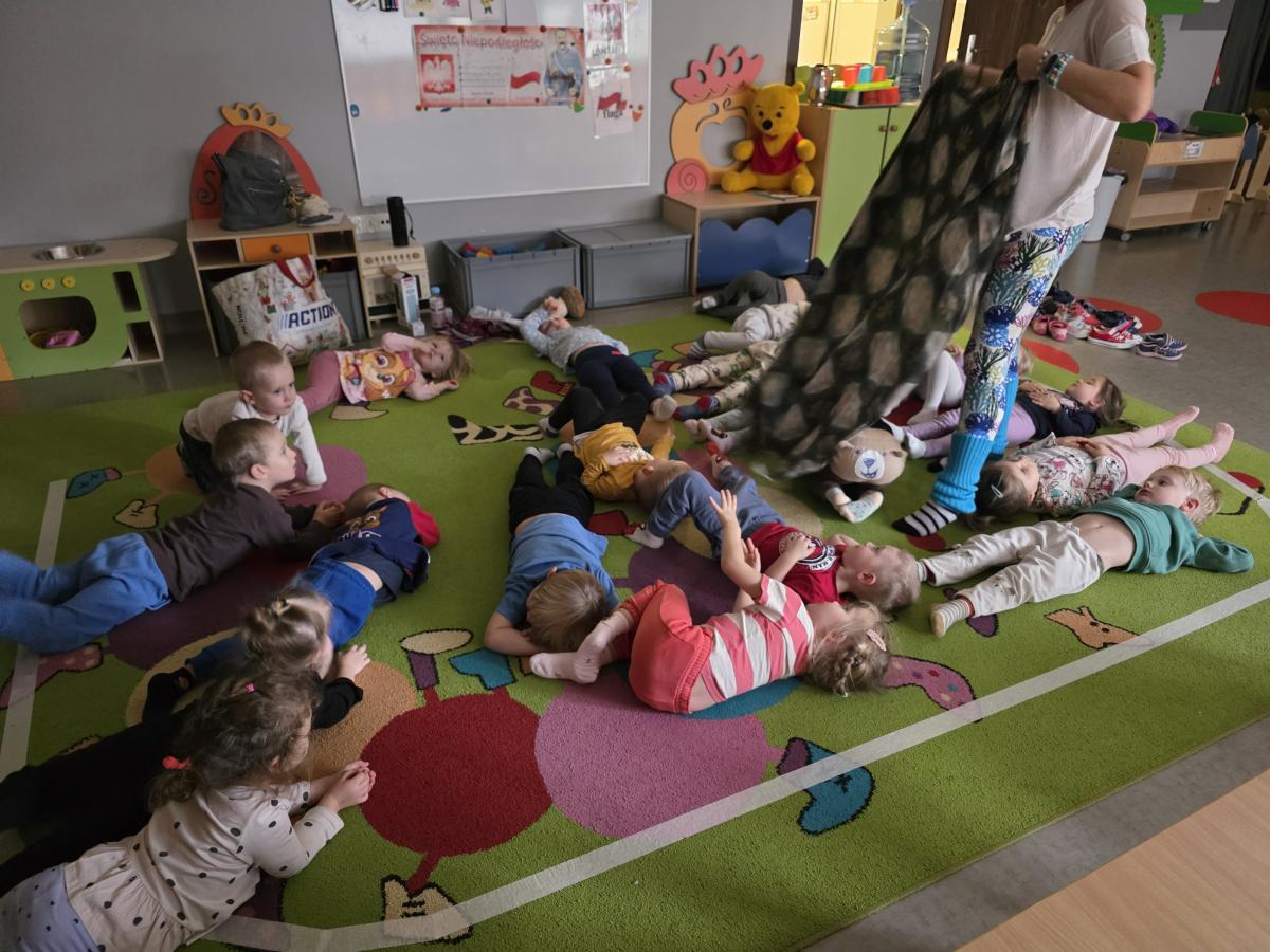 Dzieci z zaangażowaniem wykonywały kolejne asany, rozwijając równowagę, gibkość i koordynację, a jednocześnie ucząc się świadomego oddychania. Dzięki kostkom zajęcia były dynamiczne, pełne śmiechu i pozytywnej energii. Na zakończenie odbył się krótki relaks, podczas którego dzieci „opadły jak jesienne listki”, wyciszając ciało i umysł, a prowadząca przy pomocy chusty, dała im możliwość poczuć przyjemny jesienny wietrzyk.