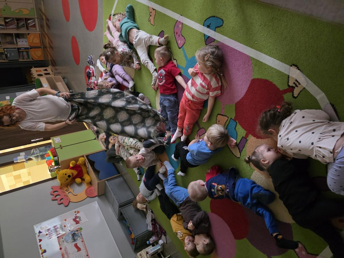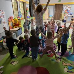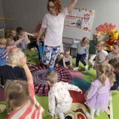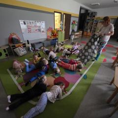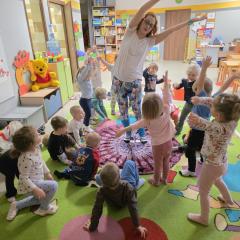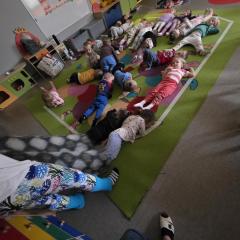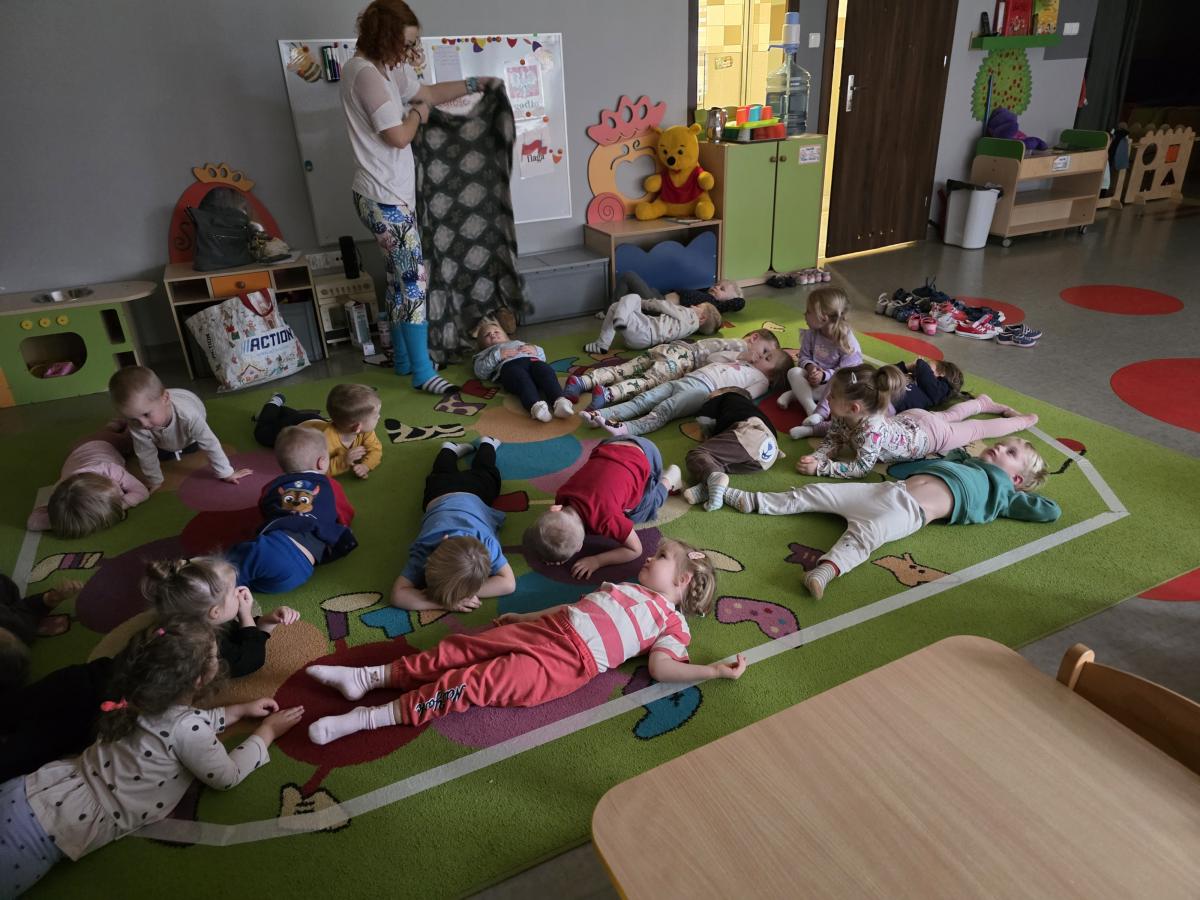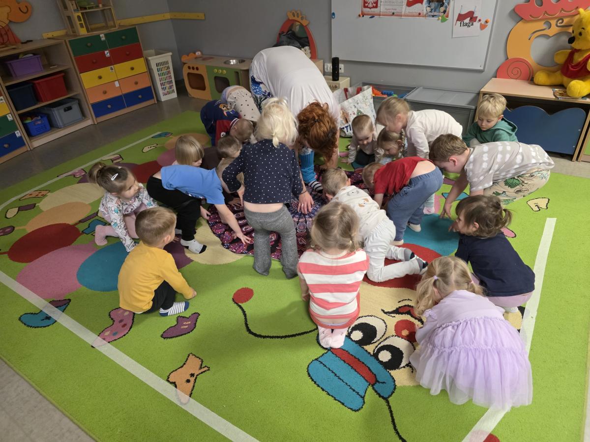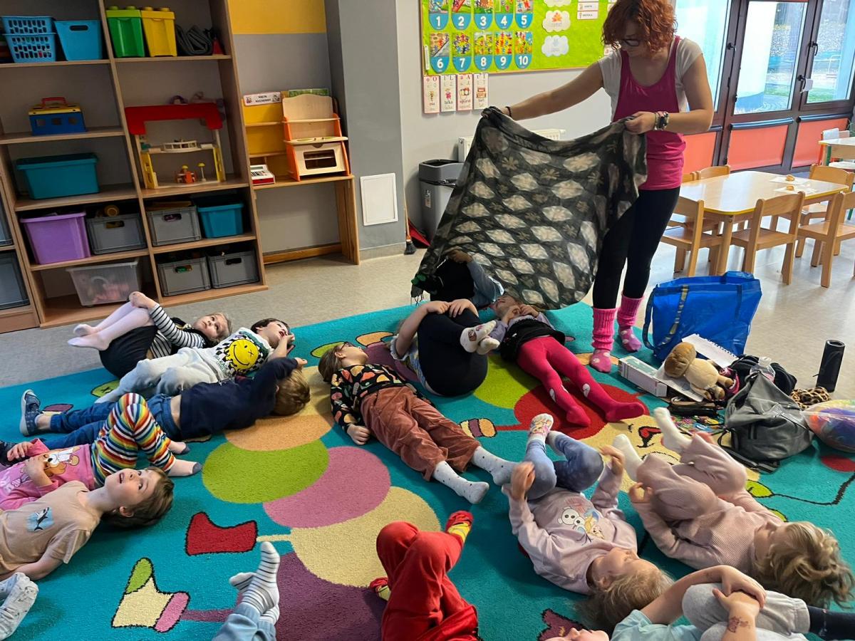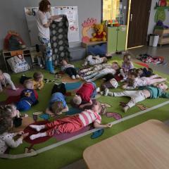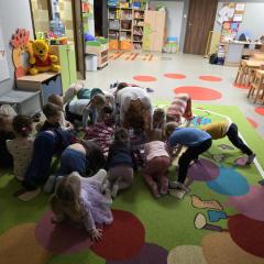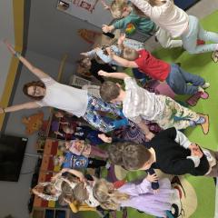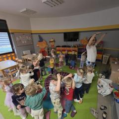 Dzieci z zaangażowaniem wykonywały kolejne asany, rozwijając równowagę, gibkość i koordynację, a jednocześnie ucząc się świadomego oddychania. Dzięki kostkom zajęcia były dynamiczne, pełne śmiechu i pozytywnej energii. Na zakończenie odbył się krótki relaks, podczas którego dzieci „opadły jak jesienne listki”, wyciszając ciało i umysł, a prowadząca przy pomocy chusty, dała im możliwość poczuć przyjemny jesienny wietrzyk.