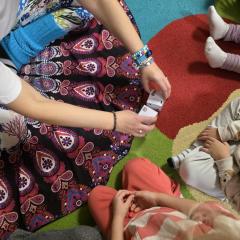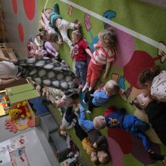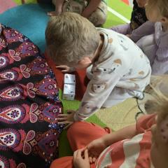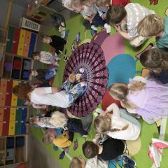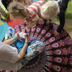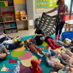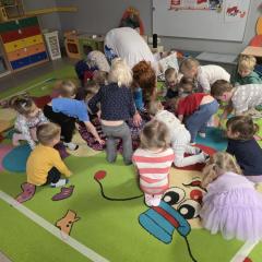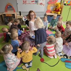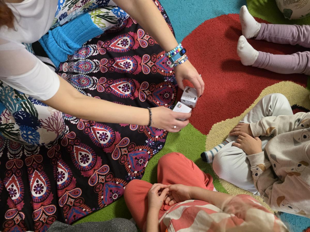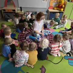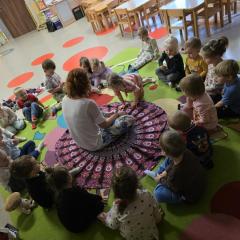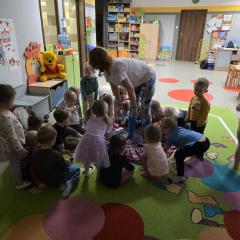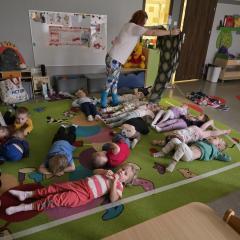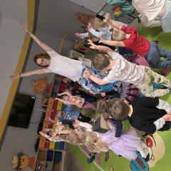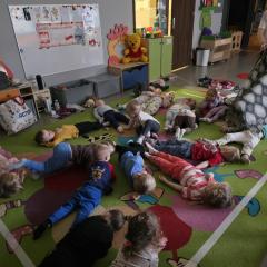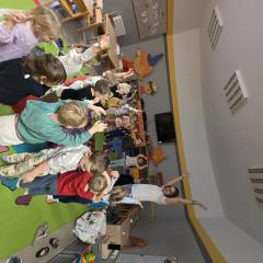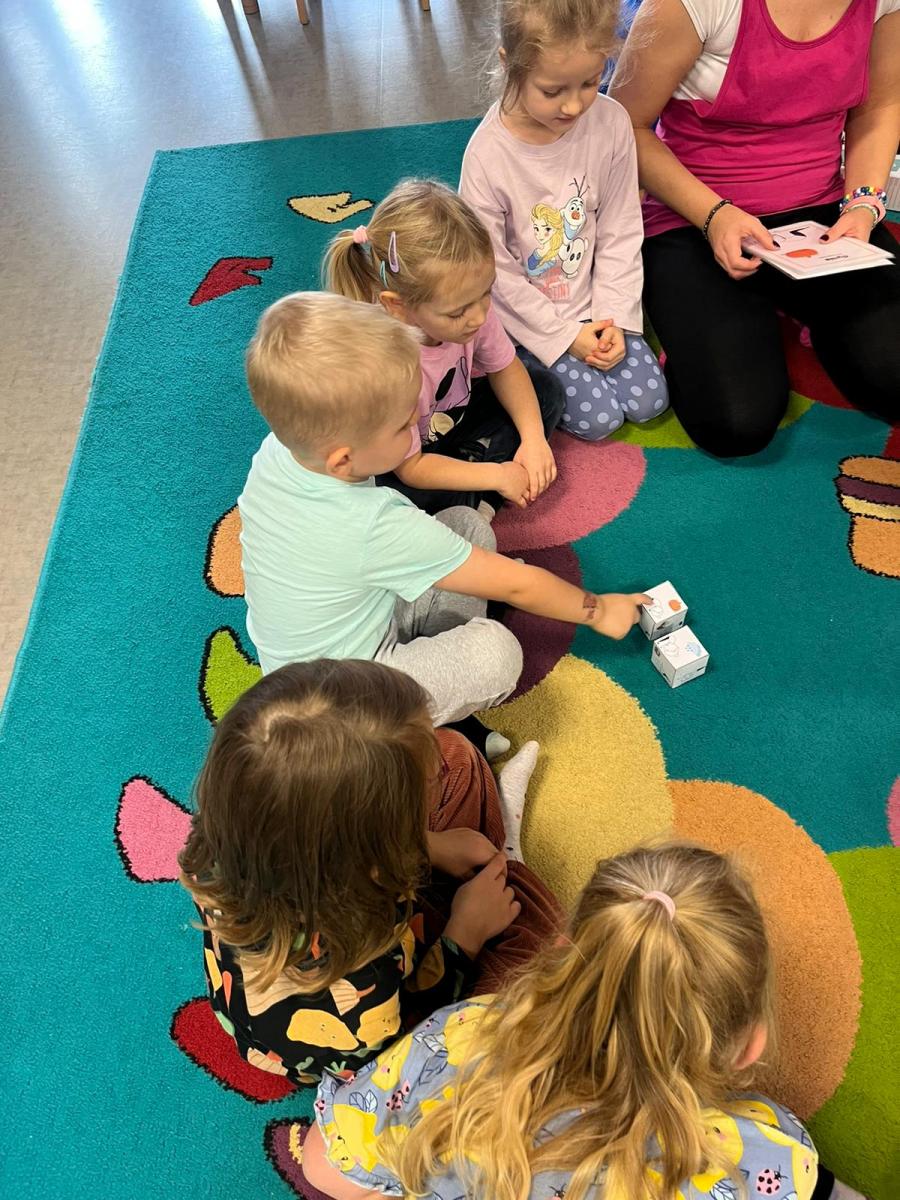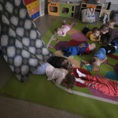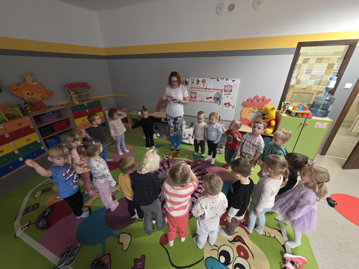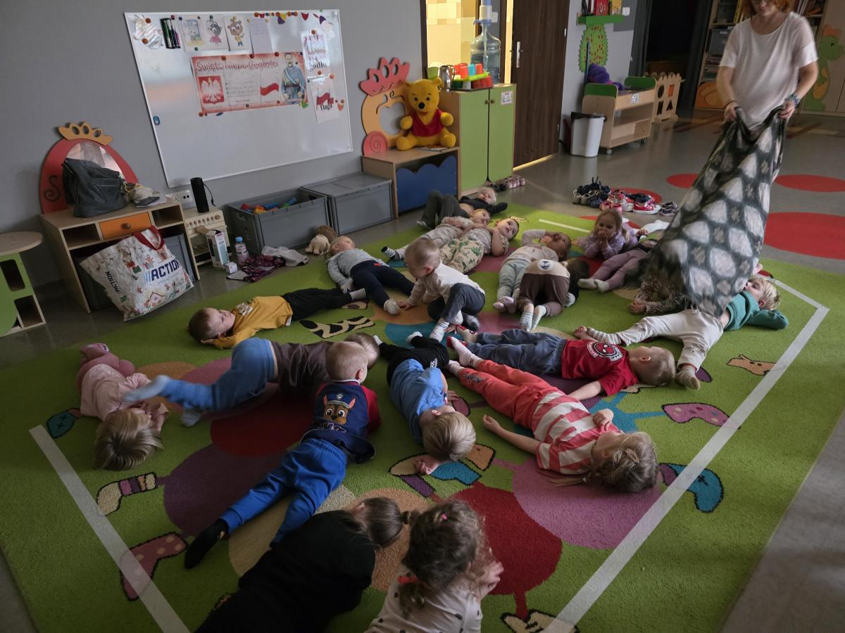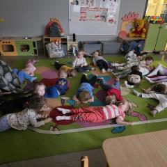 Dzieci z zaangażowaniem wykonywały kolejne asany, rozwijając równowagę, gibkość i koordynację, a jednocześnie ucząc się świadomego oddychania. Dzięki kostkom zajęcia były dynamiczne, pełne śmiechu i pozytywnej energii. Na zakończenie odbył się krótki relaks, podczas którego dzieci „opadły jak jesienne listki”, wyciszając ciało i umysł, a prowadząca przy pomocy chusty, dała im możliwość poczuć przyjemny jesienny wietrzyk.