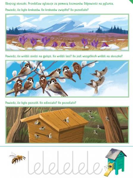 śpiew ptaków). Nad domem krążyły dwa bociany (biegają z szeroko rozłożonymi rękami), a potem brodziły po trawie, wysoko ponosząc nogi, i rozglądały się w poszukiwaniu żabek (maszerują z wysokim unoszeniem kolan, rozglądają się na boki). Klekotały cichutko, aby ich nie spłoszyć (cicho naśladują klekot bocianów). Żabki zauważyły niebezpieczeństwo i skakały w rożnych kierunkach, aby się ukryć (naśladują żabie skoki). Nawoływały się cichutko (cicho kumkają), aby nie zwrócić na siebie uwagi. Było ciepło i przyjemnie. Olek przeciągnął się, aby rozprostować kości (przeciągają się). Nagle nad uchem usłyszał ciche bzyczenie. To pszczoła krążyła nad jego głową (naśladują brzęczenie pszczoły). Chłopiec przestraszył się. Zaczął uciekać. Wymachiwał rękami, aby ją odgonić (biegają i wymachują rękami). Nagle jego uwagę zwróciły kolorowe kwiaty. Olek pochylił się i je powąchał (naśladują wąchanie kwiatów), a potem głośno kichnął (kichają: aaa… psik!). „Nie muszę już dalej szukać wiosny” – pomyślał zadowolony, a potem, uśmiechnięty, wrócił do domu (maszerują, uśmiechając się do siebie).